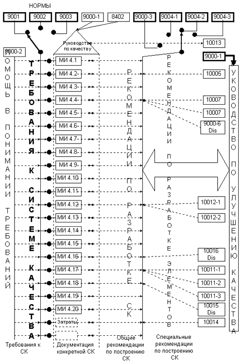 ИСО 10013: "Руководящие указания по разработке руководств по качеству". Представлены основные рекомендации по составлению головного документа системы качества - Руководства по Качеству. Предприятия могут пойти и своим путем при разработке Руководства по Качеству, поскольку для сертификации системы качества необходимо выполнение всех требований только стандарта ИСО 9001, 9002 или 9003 в зависимости от выбранной модели.